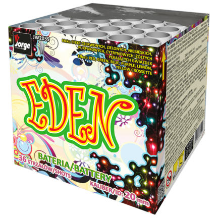 Tag med i Edens have og lad dig friste af dette blændende batteri fra Jorge. 36 flotte komet-krosetter i et overflod af farver gør Eden til en særlig oplevelse. Et batteri der skiller sig ud og samtidig et godt valg, hvis du ønsker støjsvagt fyrværkeri.