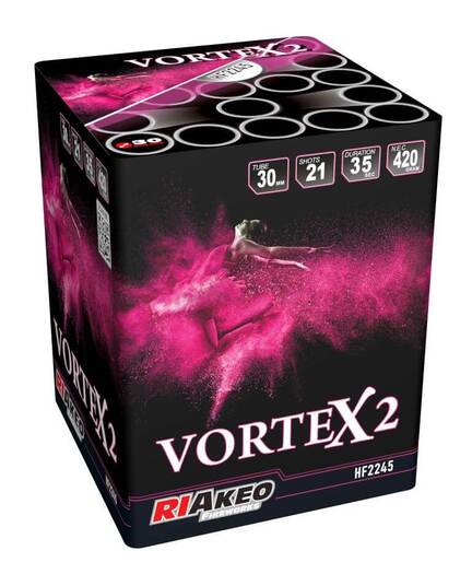 Topkvalitet fra Riakeo. Vortex 2 er brag af et 21-skuds batteri med enorme guldbomber tilsat farvede kugler i afmålt mængde. Det er ikke et batteri, der fylder meget i bagagerummet, men på himlen er det en helt anden snak.