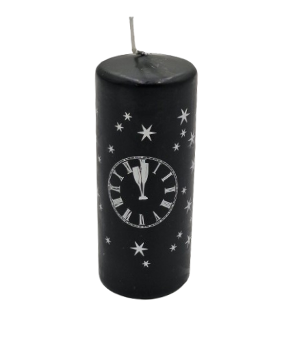 Windsor stearinlys, sort med sølv stjerner og ur. Produceret i Danmark.